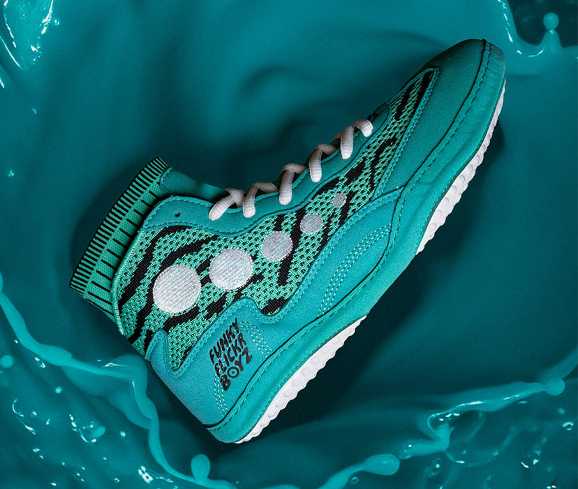 Get a competitive edge on the mat with the FFB Interlude "Mint" Wrestling Shoes. Named after its mint green accents, the shoes resemble mint chocolate chip ice cream. The shoes were built to maximize flexibility, support, and grip. Our premium Funkknit technology allows for the best fitting wrestling shoe on the market. The shoes feature an Unlimited Traction Split Sole to ensure you never slip on the mat again. The new Interlude design features a revolutionary, premium, microsuede material to maximize durability. Combining proven old-school success with advanced technology.